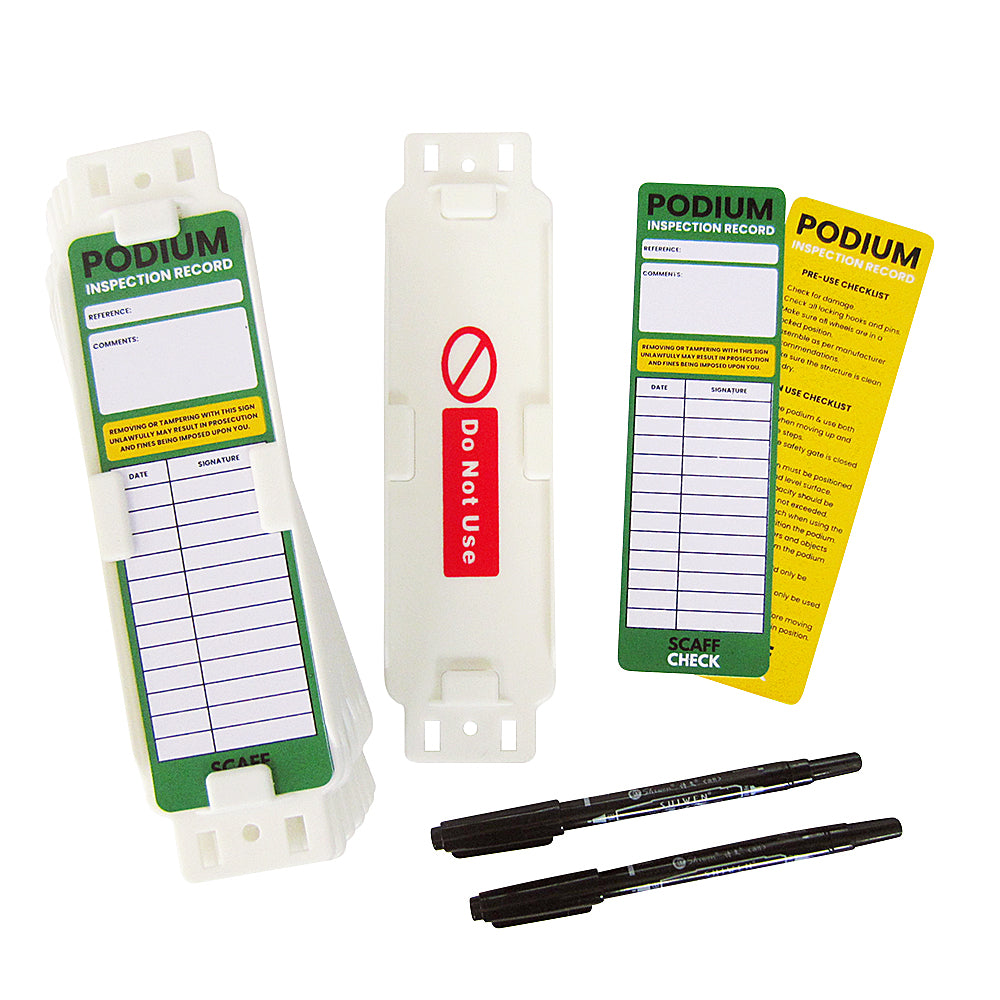 Podium Check Inspection Tag Kit - 10 Holders, 20 Double Sided Inserts and 2 Marker Pens for quick and efficient use when inspecting Scaffolding.